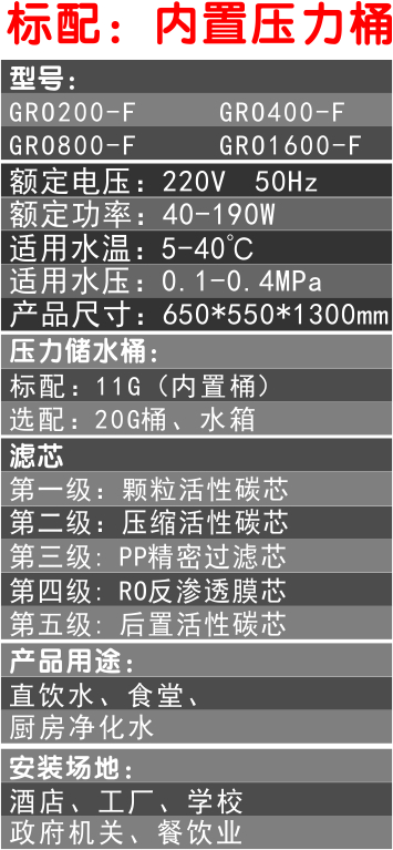 產品名稱:黑白機柜商務純水機F系列產品型號:GRO200/400/800/1600-F外形尺寸:950*550*1300mm